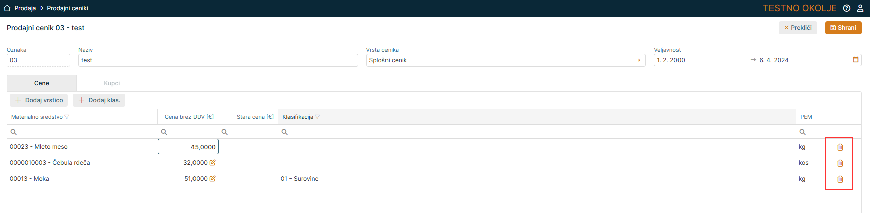 - "Datum veljavnosti" - po potrebi se spremeni datum veljavnosti cenika